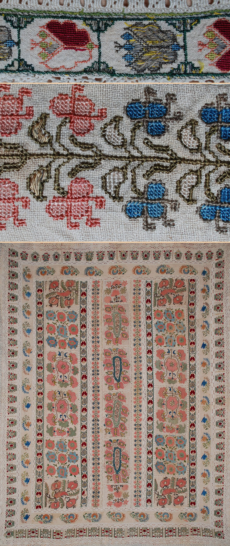 Antique Turkish Ottoman Silk Embroidery on Linen. Used as a Bed Cover. Ottoman Dynasty 1453-1922A.D Size 70" x 50" Size 178 x 127cm