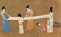 The well-preserved tomb of the Lady of Dai at Mawangdui, near Changsha (Hunan Province, in south-central China) has yielded hundreds of silk dress items and textiles, from spiral-wrapped or right-side-fastening gowns, to mittens, socks, slippers, wrapped skirts, and other garments, and bolts of uncut and unsewn silk. The textiles show a great range of dyed colors and weaving and decorating techniques, including tabby, twill, brocade, gauze, damask, and embroidery. Textual evidence from the Han period shows that government authorities attempted through sumptuary laws to restrict the use of such textiles to members of the elite landowning class, but that townsmen including merchants and artisans were finding ways to acquire and wear them also.