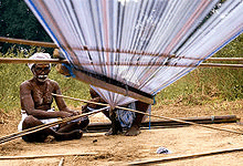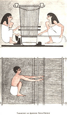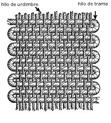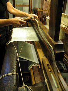 WEAVING: Weaving is the art of making cloth on a loom (q.v.). There are three fundamental weaves-plain, twill and satin. Others, such as taffeta, damasks, brocades and velvets are merely variations or complications of these three. For many centuries weaving was carried on as a household industry with little or no change in the style of the loom or in the methods employed, and though the loom was remarkably simple, even crude, the operators produced fabrics that have never been excelled in fineness of texture, even at this later day. The materials in early use in this country for weaving were wool, flax and hemp. Cotton came later. The periods just before and following the Revolutionary War are considered the high spots in American home-weaving. It was not until the latter half of the 19th century that all of the processes connected with weaving were grouped together in one establishment, the mill.